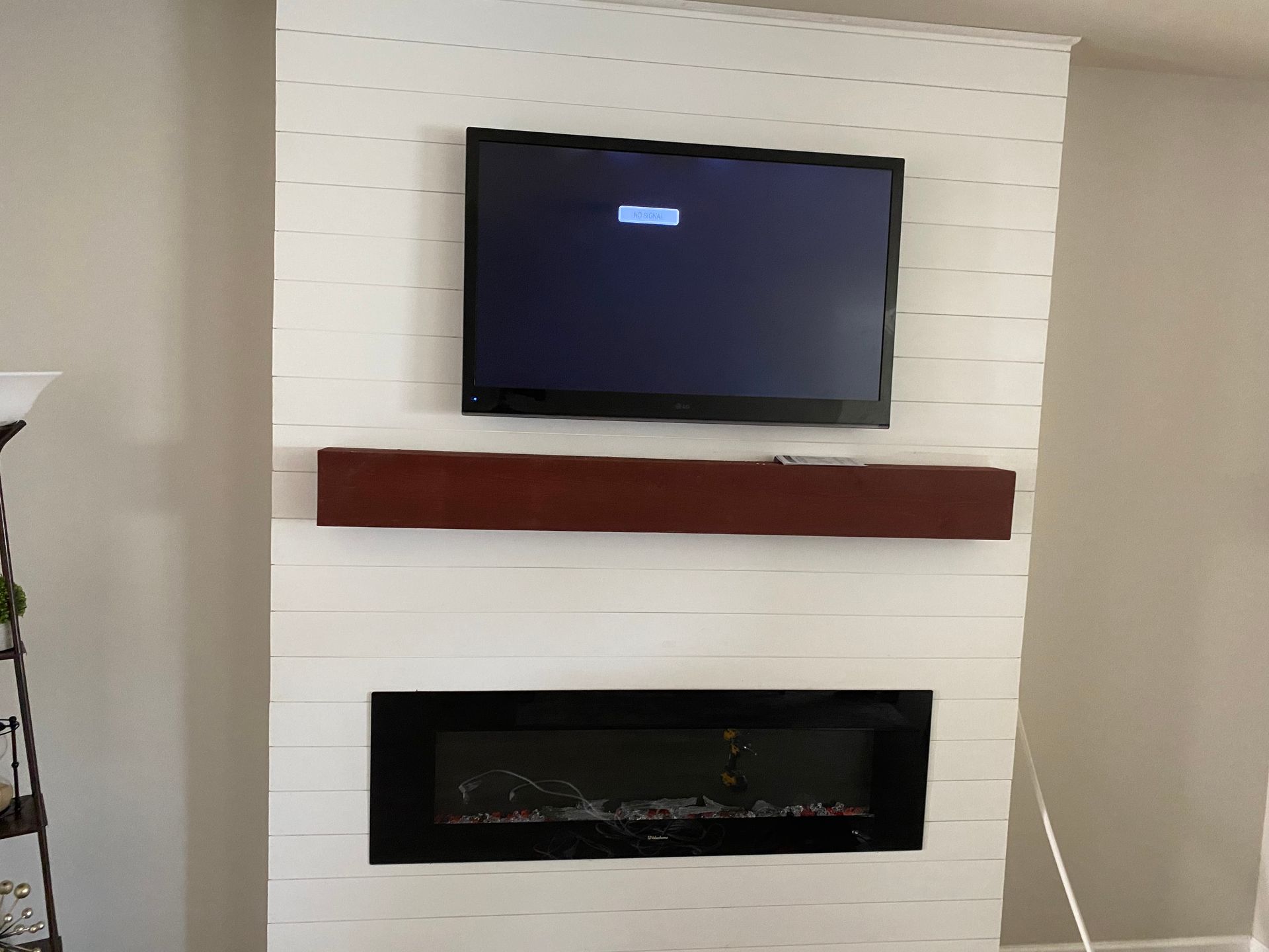 “Over-stud fireplace—used a mantel mount to drop to eye level. Genius.”