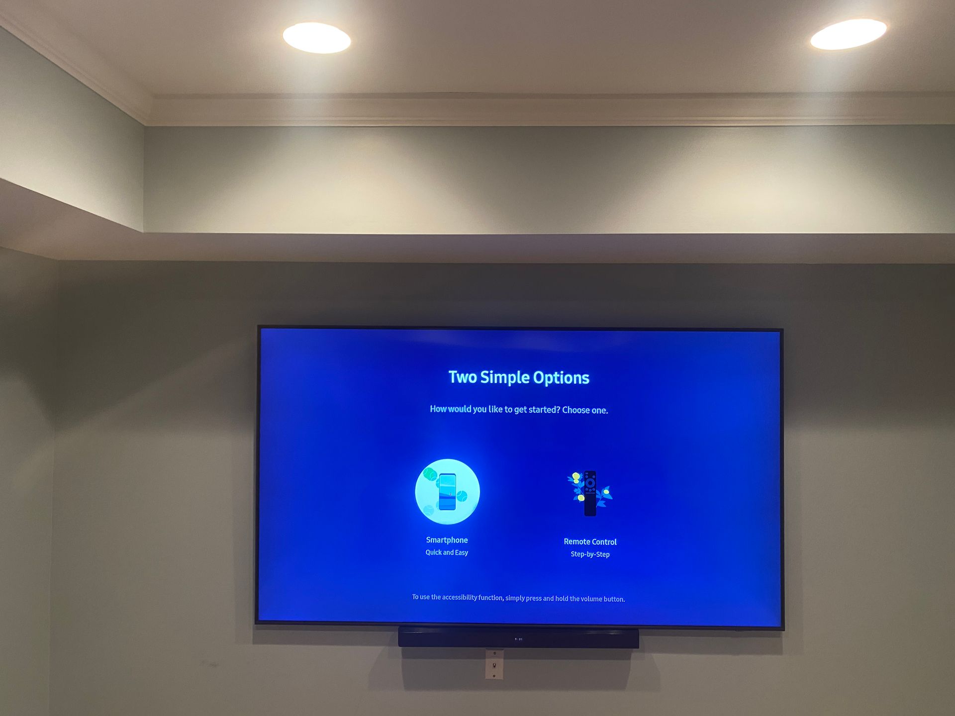 “Soundbar bracketed under the 55″—single remote control and no visible wires.”